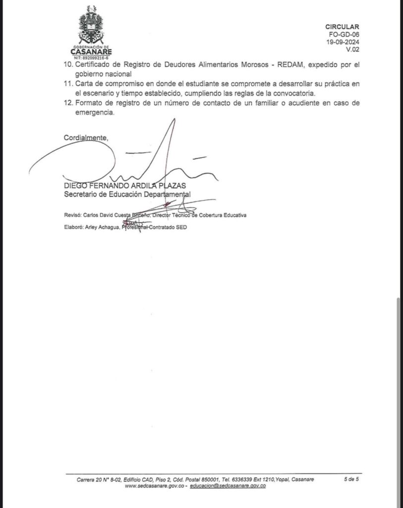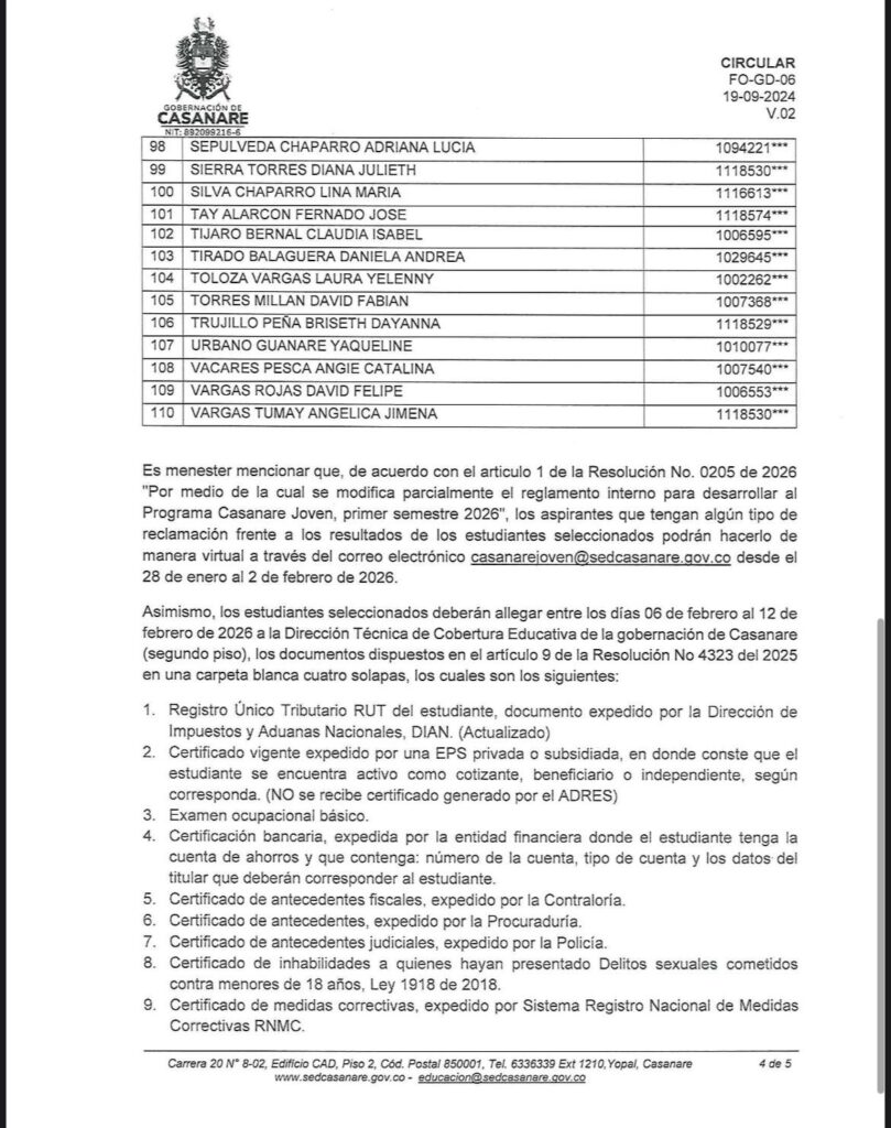 Los estudiantes seleccionados deberán presentar, entre el 6 y el 12 de febrero de 2026, los documentos requeridos en la Dirección Técnica de Cobertura Educativa de la Gobernación de Casanare (segundo piso), en carpeta blanca de cuatro solapas, según lo establecido en el artículo 9 de la Resolución No. 4323 de 2025.