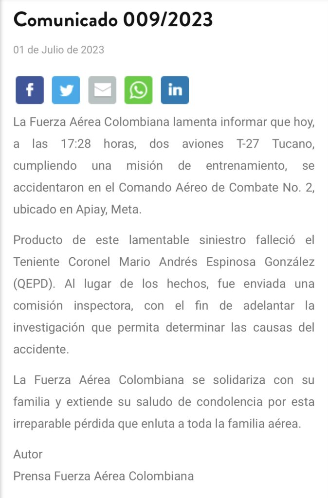#ComunicaciónOficial | La @FuerzaAereaCol informa que se presentó un accidente en la Base Aérea de Apiay, Meta, que involucró dos aeronaves de entrenamiento T-27 Tucano, siendo aproximadamente las 17:30 horas.