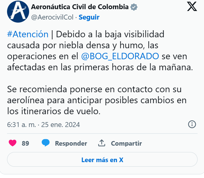“Debido a la baja visibilidad causada por niebla densa y humo, las operaciones en el @BOG_ELDORADO se ven afectadas en las primeras horas de la mañana. Se recomienda ponerse en contacto con su aerolínea para anticipar posibles cambios en los itinerarios de vuelo”, sostiene.