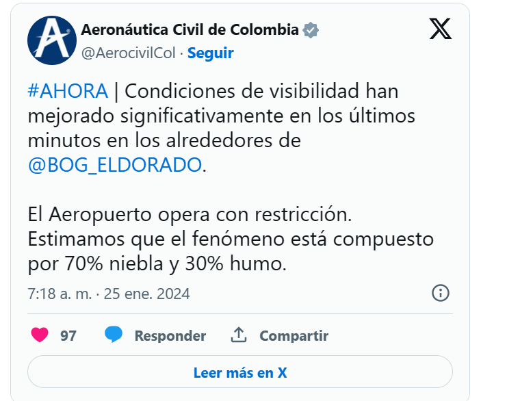 Una hora más tarde, la entidad aseguró que la situación estaba volviendo a la normalidad. “Condiciones de visibilidad han mejorado significativamente en los últimos minutos en los alrededores de @BOG_ELDORADO. El Aeropuerto opera con restricción. Estimamos que el fenómeno está compuesto por 70 % niebla y 30 % humo”, agregó.