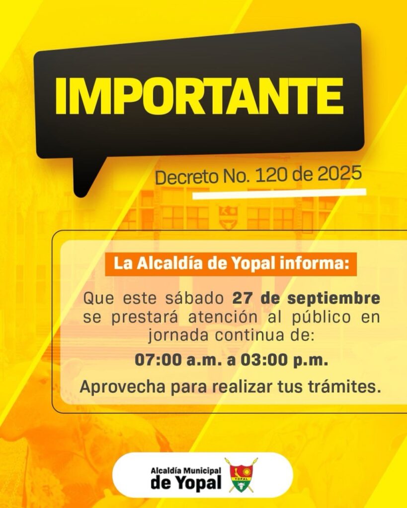 La Administración Municipal de Yopal anunció que este sábado atenderá en jornada continua de 7:00 a.m. a 3:00 p.m., en cumplimiento del Decreto No. 120 de 2025, que estableció jornadas especiales de atención los días 6 y 27 de septiembre, 18 de octubre y 22 de noviembre.