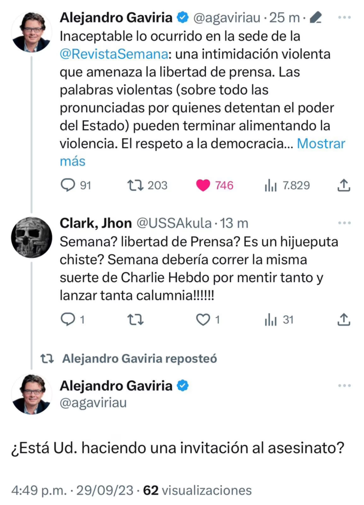 “Inaceptable lo ocurrido en la sede de la Revista SEMANA: una intimidación violenta que amenaza la libertad de prensa. Las palabras violentas (sobre todo las pronunciadas por quienes detentan el poder del Estado) pueden terminar alimentando la violencia. El respeto a la democracia comienza por el respeto a las distintas formas de expresión y pensamiento”, escribió Gaviria en su cuenta de X (antes Twitter).