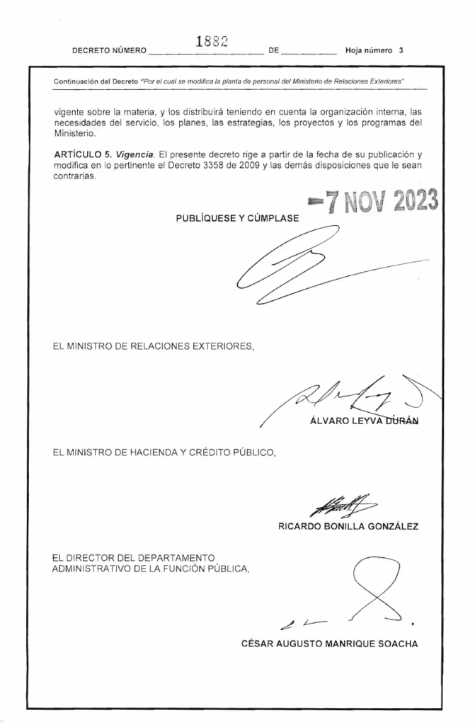 El acto protocolario se produjo horas después de que el canciller de Colombia, Álvaro Leyva, quien le firmó su decreto de nombramiento, acatara la suspensión provisional en su contra por parte de la Procuraduría General por el escándalo de los pasaportes.