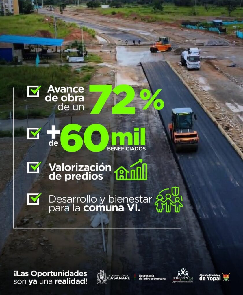 La intervención ha sido viabilizada por la Secretaría de Infraestructura Departamental y su ejecución está a cargo de ACUATODOS, con el objetivo de entregar una vía moderna, segura y funcional que transformará la movilidad y la calidad de vida en Yopal.