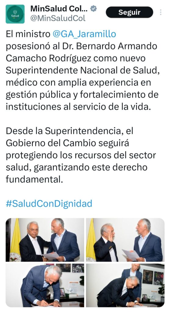 Se hizo oficial el nombramiento de Bernardo Armando Camacho Rodríguez como nuevo superintendente Nacional de Salud, pese a las alarmas que encendieron los sectores sobre la supuesta inconveniencia de su llegada al cargo.