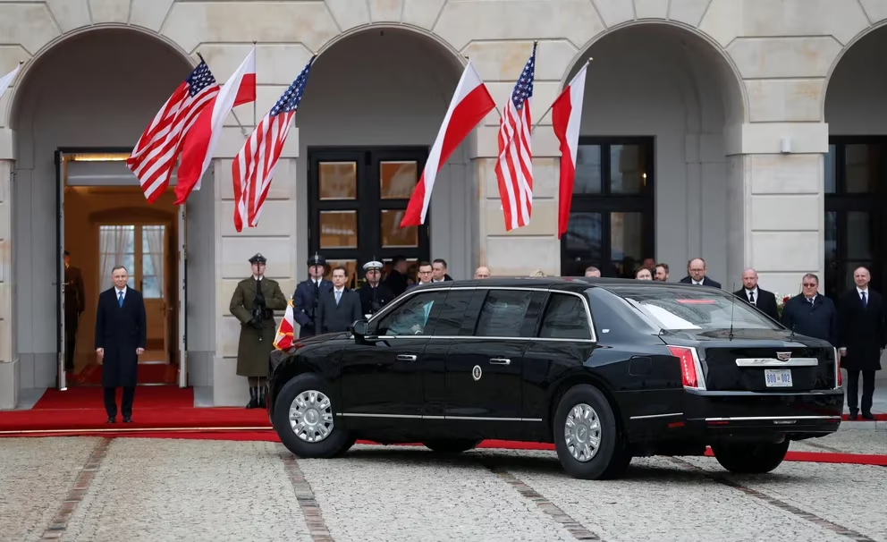 Una vez en Varsovia, donde arranca este martes su agenda oficial en Polonia, Biden se desplazó en su coche oficial, conocido como “La Bestia”