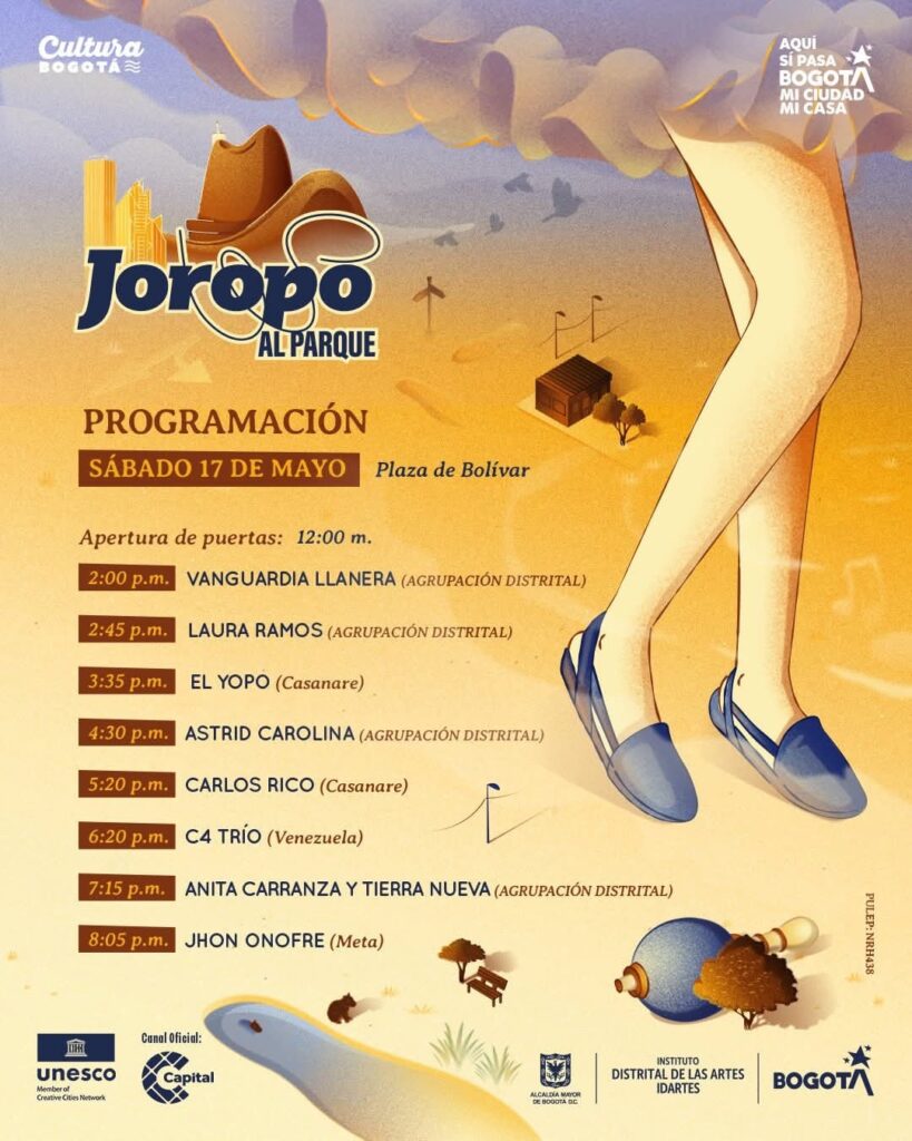 Durante dos días, artistas de gran trayectoria y agrupaciones distritales se darán cita para compartir con los bogotanos lo mejor del joropo, incluyendo representación de regiones como Meta, Casanare, Vichada, Arauca y Venezuela, además de propuestas nacionales e internacionales.