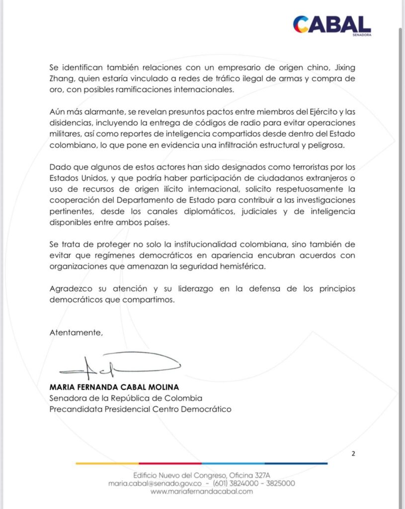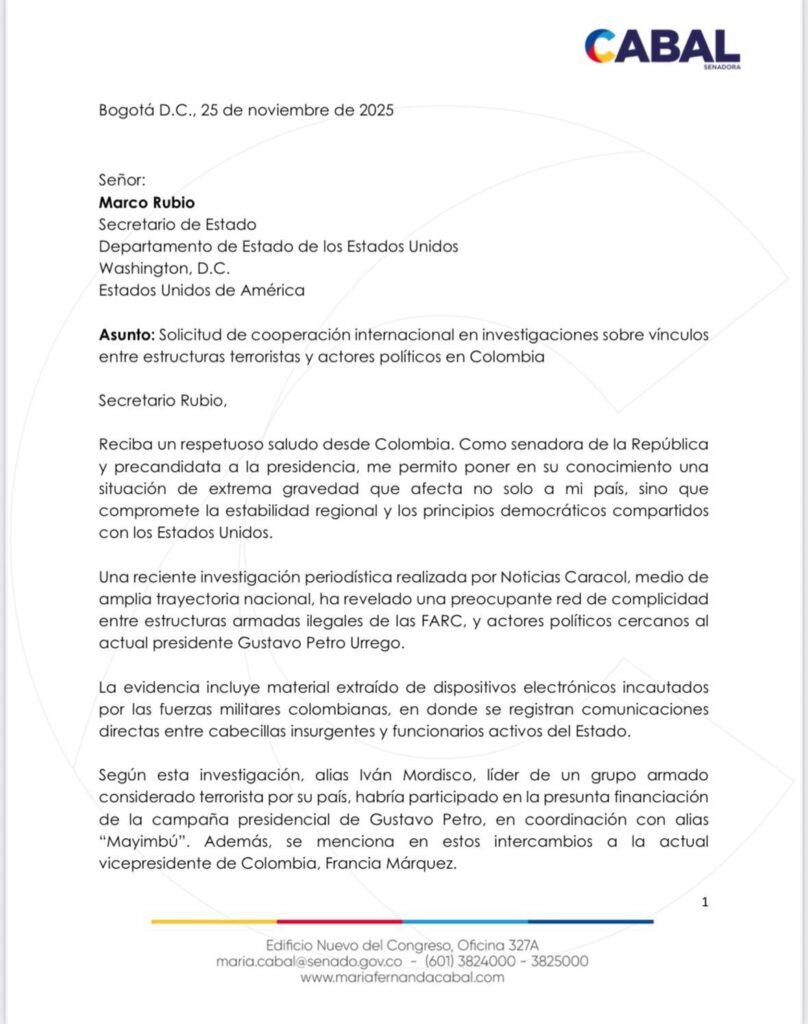 La senadora y precandidata presidencial María Fernanda Cabal informó que envió una comunicación oficial al secretario de Estado de los Estados Unidos, Marco Rubio, solicitando cooperación internacional para esclarecer los graves señalamientos sobre presuntos vínculos entre estructuras criminales de las disidencias y actores políticos colombianos cercanos al presidente Gustavo Petro.