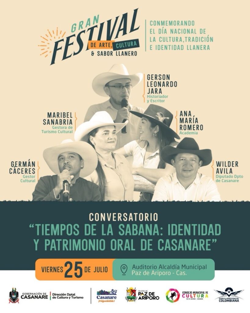 La Gobernación de Casanare, a través de la Dirección Departamental de Cultura y Turismo, en articulación con la Alcaldía Municipal y el Consejo Municipal de Cultura, invita a la ciudadanía a participar en el Gran Festival de Arte, Cultura y Sabor Llanero, una jornada de exaltación de nuestras raíces culturales, que se llevará a cabo este viernes 25 de julio en el municipio de Paz de Ariporo.