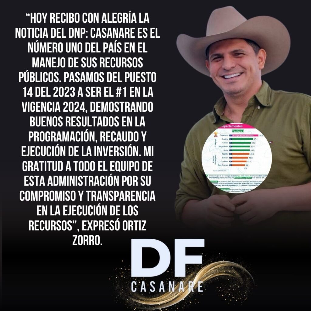“Hoy recibo con alegría la noticia del DNP: Casanare es el número uno del país en el manejo de sus recursos públicos. Pasamos del puesto 14 del 2023 a ser el #1 en la vigencia 2024, demostrando buenos resultados en la programación, recaudo y ejecución de la inversión. Mi gratitud a todo el equipo de esta administración por su compromiso y transparencia en la ejecución de los recursos”, expresó Ortiz Zorro.