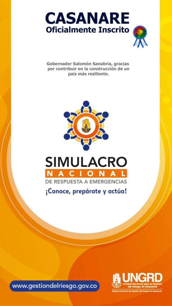 El gobernador Salomón Sanabria inscribió a Casanare en el Simulacro Nacional de Respuesta a Emergencias, donde se espera la participación de planteles educativos, hospitales, organismos de socorro, fuerzas militares, empresas tanto públicas como privadas y comunidad en general.