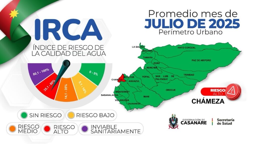 En riesgo alto, con un IRCA entre 50 y 75% figura únicamente Chámeza, debido a niveles inadecuados de cloro residual, color aparente fuera de rango y turbiedad superior a lo permitido.