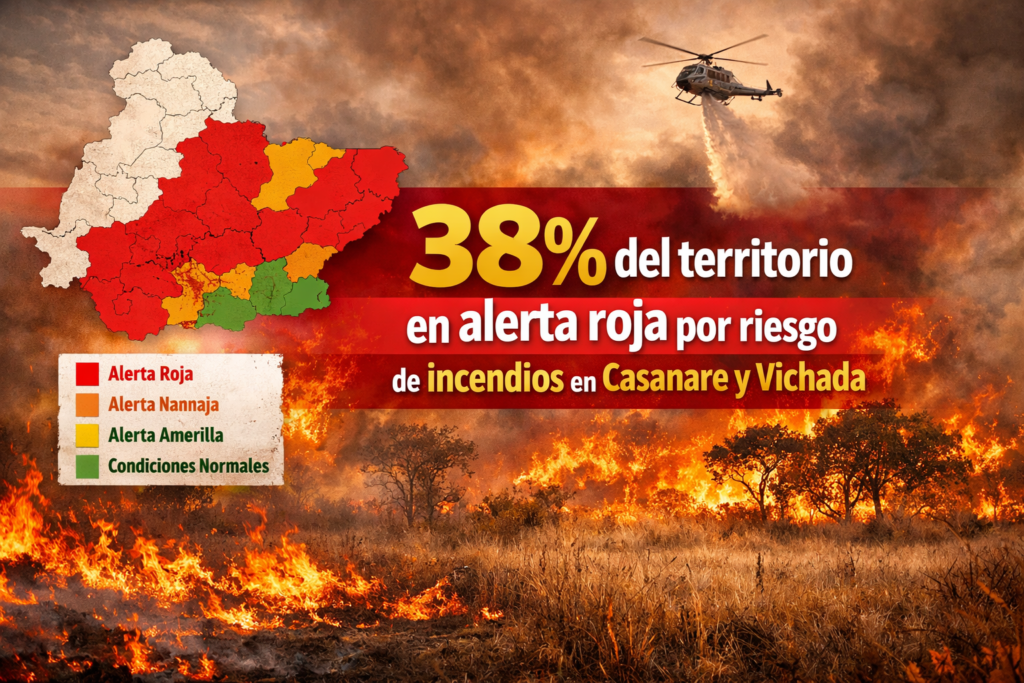 Un aumento significativo en la amenaza por incendios de cobertura vegetal fue reportado por el Instituto de Hidrología, Meteorología y Estudios Ambientales (IDEAM) para la jurisdicción de Corporinoquia, donde actualmente el 38% del territorio se encuentra en alerta roja, el 16% en alerta naranja, el 4% en alerta amarilla y el 42% en condiciones normales.