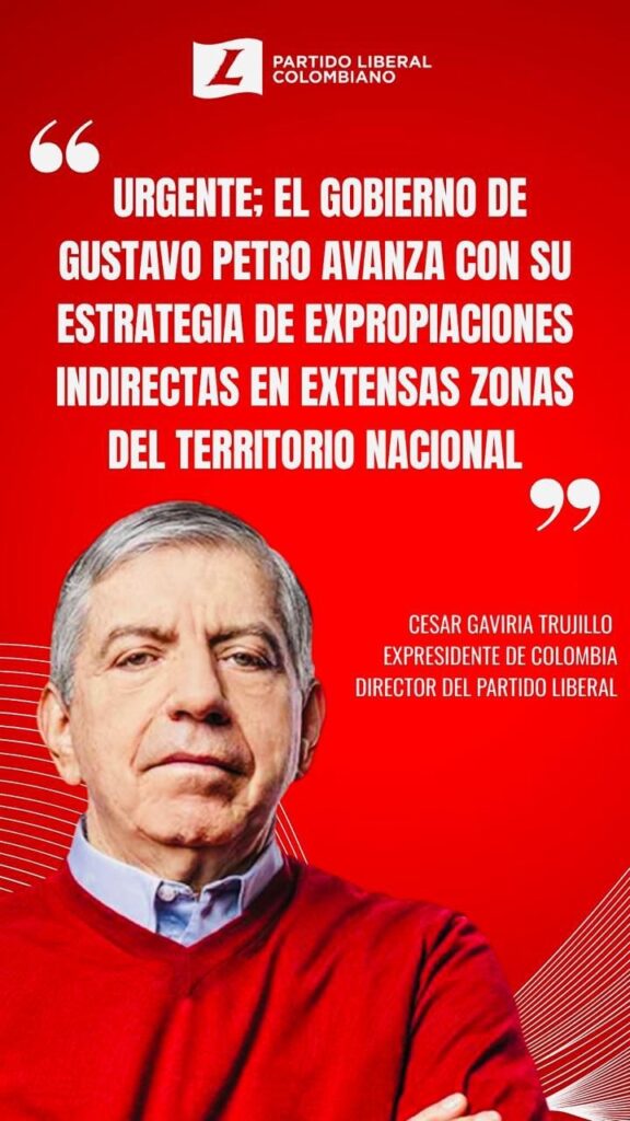 El expresidente César Gaviria Trujillo, director del Partido Liberal, lanzó una dura advertencia contra el Gobierno de Gustavo Petro, al que acusa de implementar una estrategia de “expropiaciones indirectas” que, según él, afectan extensas zonas del territorio nacional.