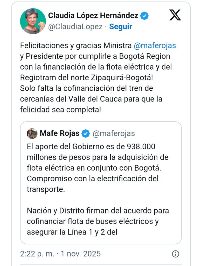 “¡Felicitaciones y gracias, ministra @maferojas y presidente, por cumplirle a Bogotá Región con la financiación de la flota eléctrica y del Regiotram del norte Zipaquirá-Bogotá! Solo falta la cofinanciación del tren de cercanías del Valle del Cauca para que la felicidad sea completa!”, indicó López.