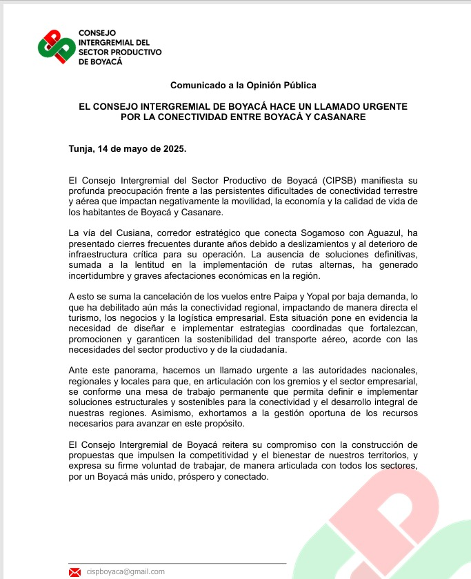 Ante las persistentes dificultades en la conectividad terrestre y aérea entre los departamentos de Boyacá y Casanare, el Consejo Intergremial del Sector Productivo de Boyacá (CIPSB) emitió un llamado urgente a las autoridades nacionales, regionales y locales para tomar medidas inmediatas que mitiguen el impacto negativo que esta situación está generando en la movilidad, la economía y la calidad de vida de los habitantes de la región.