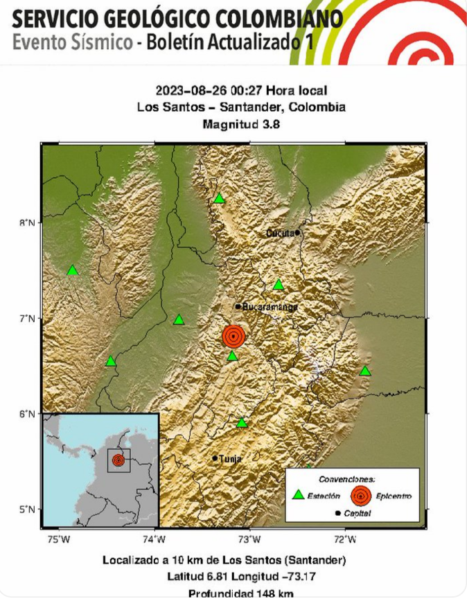 “Evento sísmico. Boletín actualizado: 2023-08-26, 00:27 (hora local), magnitud 3,8 y profundidad 148 km. Ubicación: Los Santos, Santander (Colombia)”, puntualizó el SGC.