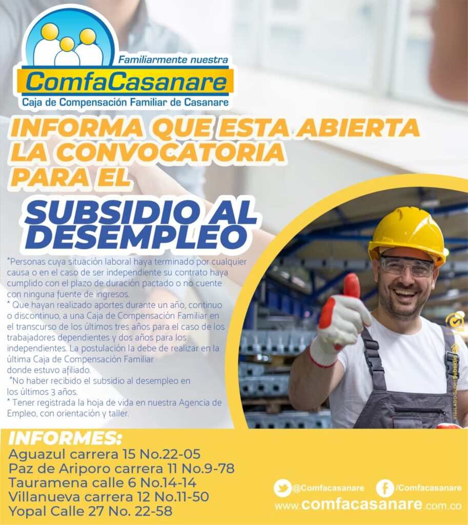 COMFACASANARE informa a la ciudadanía que se encuentra abierta la convocatoria para subsidio al desempleo.