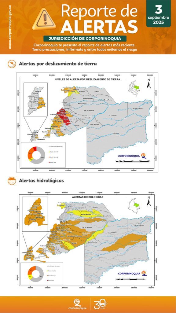 La Corporación Autónoma Regional de la Orinoquía (Corporinoquia), autoridad ambiental en 45 municipios y 5 departamentos de su jurisdicción, informó a la comunidad y a las entidades territoriales sobre el estado actual de las alertas por deslizamientos de tierra e inundaciones durante la presente temporada de lluvias.