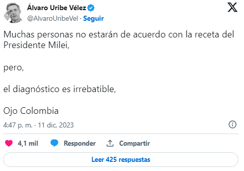 En su cuenta de X, Uribe publicó: “Muchas personas no estarán de acuerdo con la receta del Presidente Milei, pero, el diagnóstico es irrebatible”.