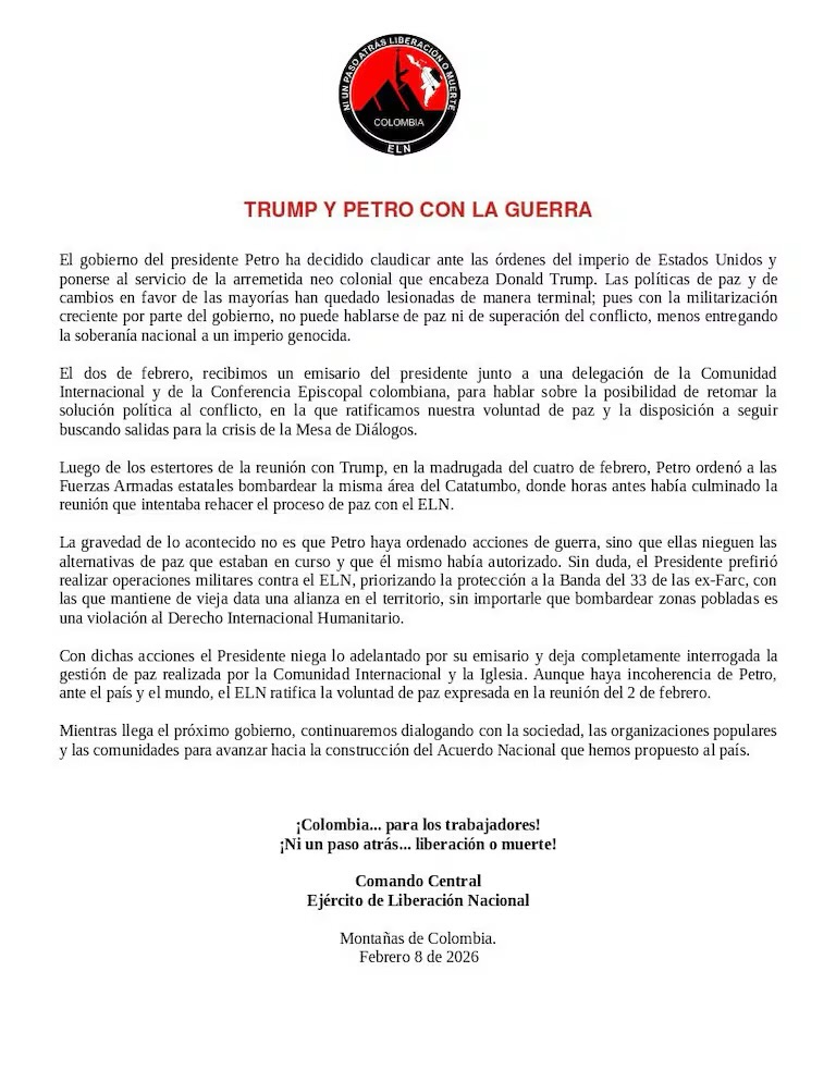 En el documento, la guerrilla asegura que el mandatario “ha decidido claudicar ante las órdenes del imperio de Estados Unidos y ponerse al servicio de la arremetida neocolonial que encabeza Donald Trump”, señalando que las políticas de la denominada “paz total” habrían quedado “lesionadas de manera terminal” por el giro militar del Gobierno.