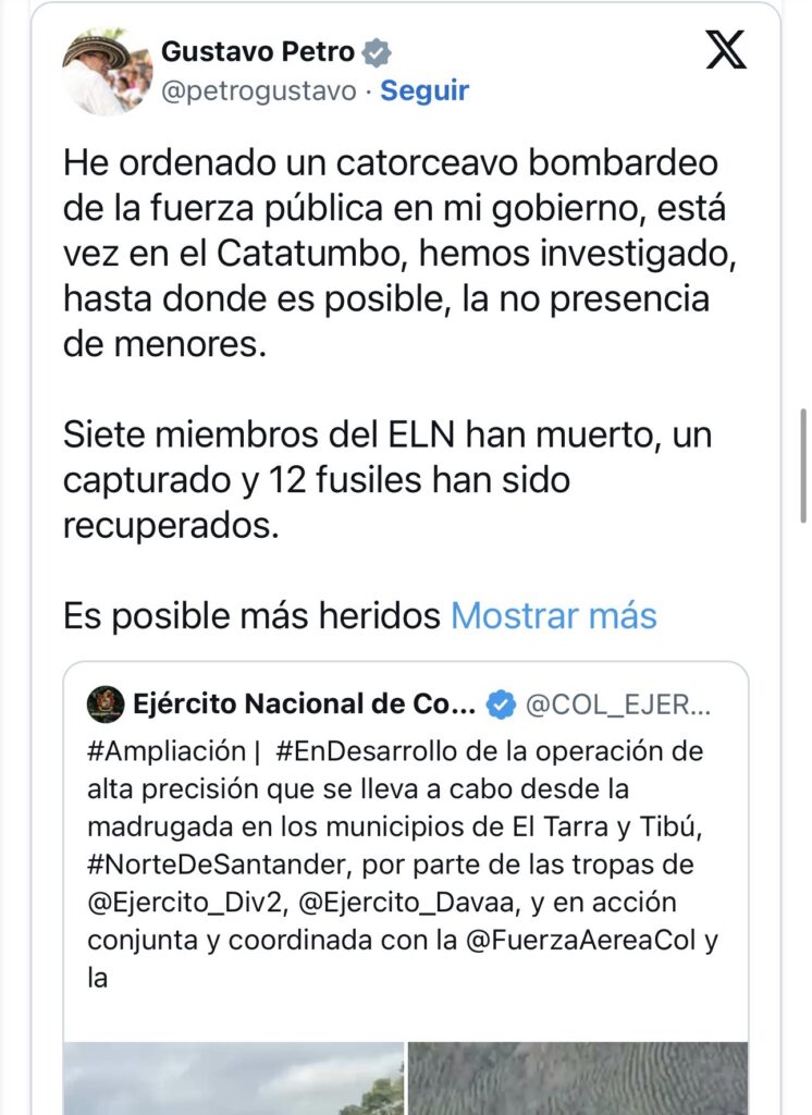 El pronunciamiento del ELN se produce tras el operativo militar realizado el 4 de febrero en el Catatumbo, operación que fue confirmada públicamente por el propio presidente Petro a través de su cuenta en X. En su mensaje, el jefe de Estado informó que se trató del bombardeo número catorce ordenado durante su gobierno, asegurando que se investigó la no presencia de menores en la zona.