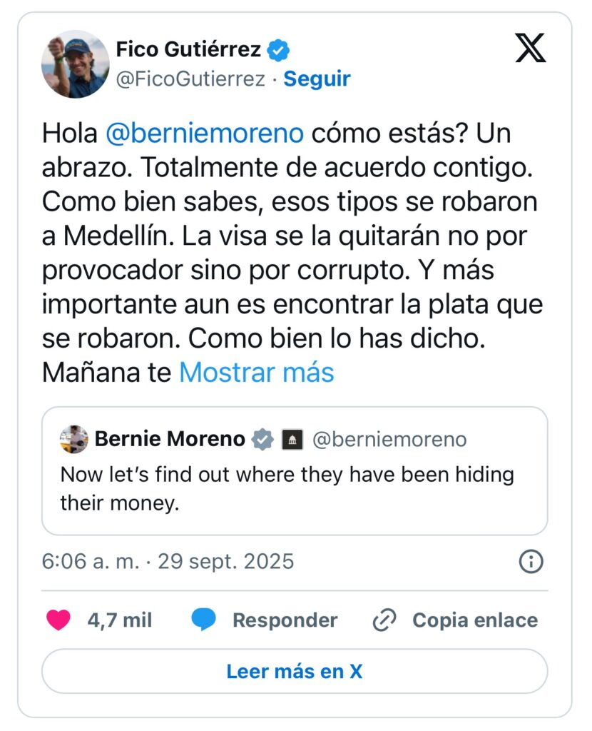 En un verdadero culebrón político con tintes internacionales, Federico Gutiérrez decidió sacar las garras y encender los reflectores sobre Daniel Quintero y sus supuestos socios. Tras los señalamientos del senador estadounidense Bernie Moreno sobre posibles maniobras financieras de Quintero, el alcalde de Medellín no dudó en respaldar la investigación… con un toque de ironía que deja ver que esto va en serio.