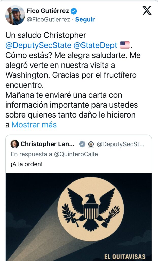 El intercambio de mensajes también alcanzó al subsecretario de Estado de EE. UU., Christopher Landau, a quien Gutiérrez le confirmó que enviará información sobre los daños ocasionados durante la administración de Quintero. Queda claro que, en este capítulo político, nadie se va a ahorrar los dardos.