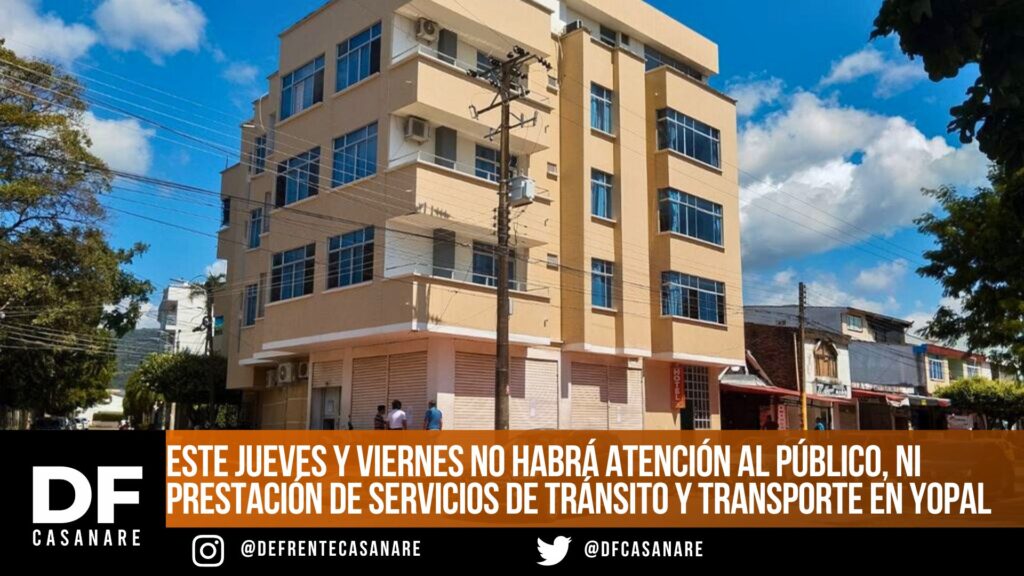 La Alcaldía de Yopal a través de la Secretaría de Movilidad, se permite informar a la comunidad en general, que los días jueves 05 y viernes 06 de diciembre del 2024, no se prestará la atención a la comunidad, ni a los ciudadanos que requiera algún trámite o servicio relacionado con tránsito y transporte, en las instalaciones donde funciona la concesión SETTY.