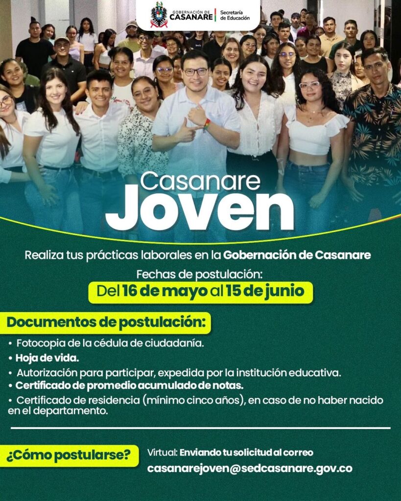 La Gobernación de Casanare, a través de la Secretaría de Educación, informa a la comunidad estudiantil que se encuentra abierta la convocatoria para el programa Casanare Joven, correspondiente al segundo semestre del año 2025, de acuerdo con la Resolución 2408 del 16 de mayo de 2025.