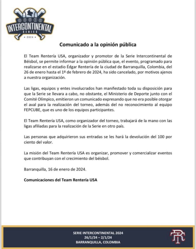 “El Team Rentería USA, organizador y promotor de la Serie intercontinental de Béisbol, se permite informar a la opinión pública que, el evento, programado para realizarse en el estadio Édgar Rentería de la ciudad de Barranquilla, Colombia, del 26 de enero hasta el 12 de febrero de 2024, ha sido cancelado, por motivos ajenos nuestra organización», indica el documental