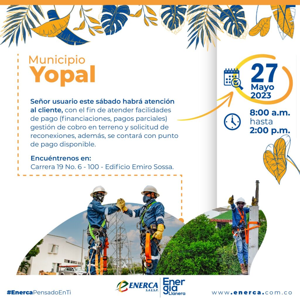 La Empresa de Energía de Casanare informa a sus usuarios que este sábado 27 de mayo de 2023 habrá atención al cliente de 8:00 a.m. a 2:00 p.m. con el fin de atender facilidades de pago (financiaciones, pagos parciales) gestión de cobro en terreno y solicitud de reconexiones, además, se contará con punto de pago disponible.