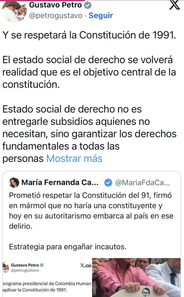 En respuesta, el presidente publicó un mensaje asegurando que se respetará la Constitución de 1991 y afirmó que el objetivo central es consolidar el “estado social de derecho”. Según Petro, este no se limita a la entrega de subsidios, sino a la garantía de derechos fundamentales para las personas.