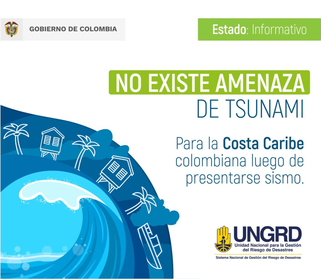 La Unidad Nacional para la Gestión del Riesgo de Desastres señaló que, de acuerdo con la Dimar, no existe amenaza de tsunami para la Costa Caribe colombiana tras el fuerte sismo que se produjo a 10 km de la frontera con Panamá.