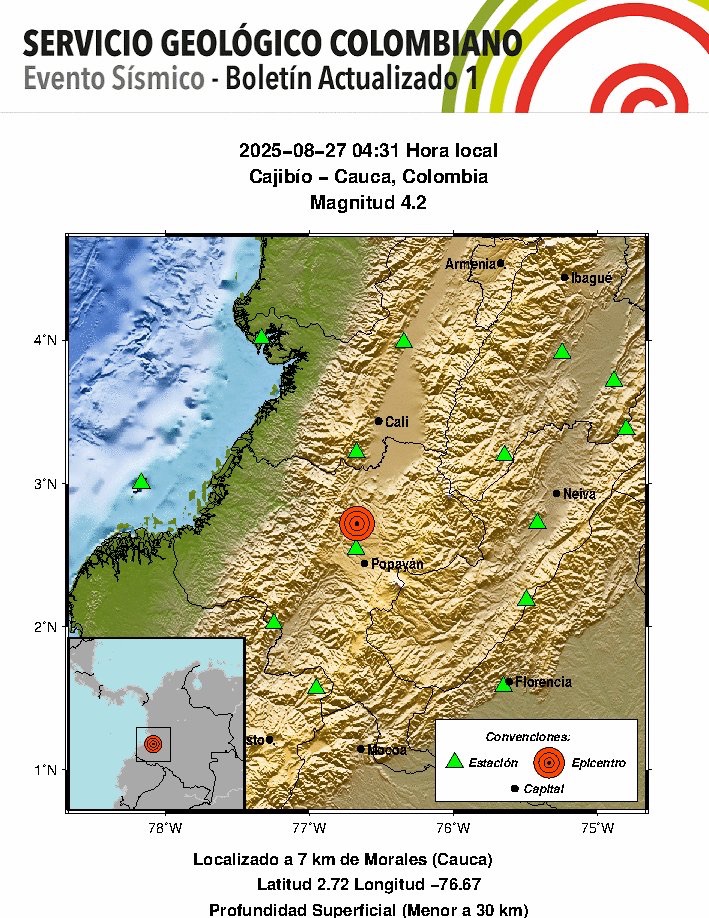 Además, el SGC confirmó que el epicentro fue el municipio de Cajibío, en Cauca, y diferentes usuarios confirmaron haber sentido el temblor a través de redes sociales, aunque sin grandes repercusiones en cuanto a daños en infraestructura.