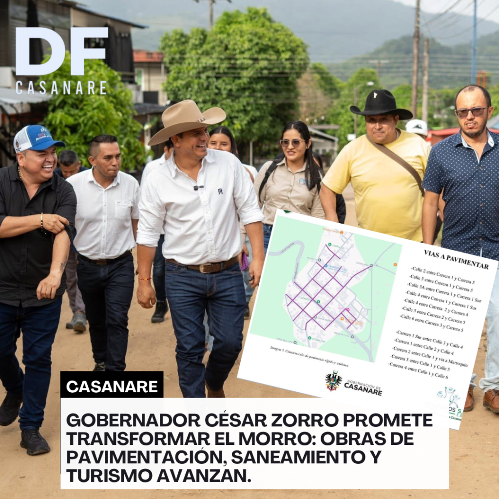 El gobernador del departamento, César Zorro, anunció a través de sus redes sociales que el centro poblado de El Morro vivirá una transformación integral con obras que incluyen la pavimentación del 85% de sus vías internas, la construcción del sistema de alcantarillado pluvial y sanitario, la optimización de la Planta de Tratamiento de Aguas Residuales (PTAR) y la iluminación de su calle principal.