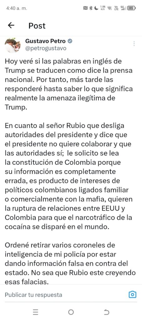 El presidente Gustavo Petro respondió a las declaraciones del mandatario estadounidense Donald Trump, quien no descartó la posibilidad de una operación en Colombia en el marco de sus cuestionamientos al Gobierno colombiano.