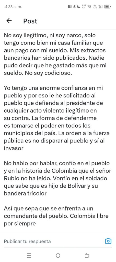En su mensaje, Petro afirmó que ha solicitado a sus seguidores defenderlo ante cualquier acto violento “ilegitimo” y afirmó que la forma de hacerlo sería: