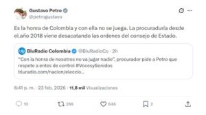 Desde su cuenta en X, el mandatario afirmó: “Es la honra de Colombia y con ella no se juega”, al referirse a su defensa de las denuncias que ha formulado sobre el sistema de votación y al responder directamente a las declaraciones del titular del Ministerio Público.