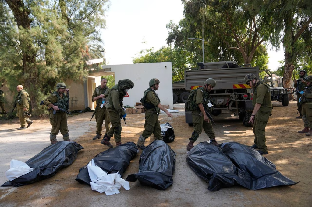 Soldados israelíes junto a los cuerpos de israelíes asesinados por militantes de Hamas en el kibutz Kfar Azza el martes 10 de octubre de 2023. Los militantes de Hamas invadieron Kfar Azza el sábado, donde muchos israelíes fueron asesinados y hechos cautivos. (Foto AP/Ohad Zwigenberg) | Foto: AP