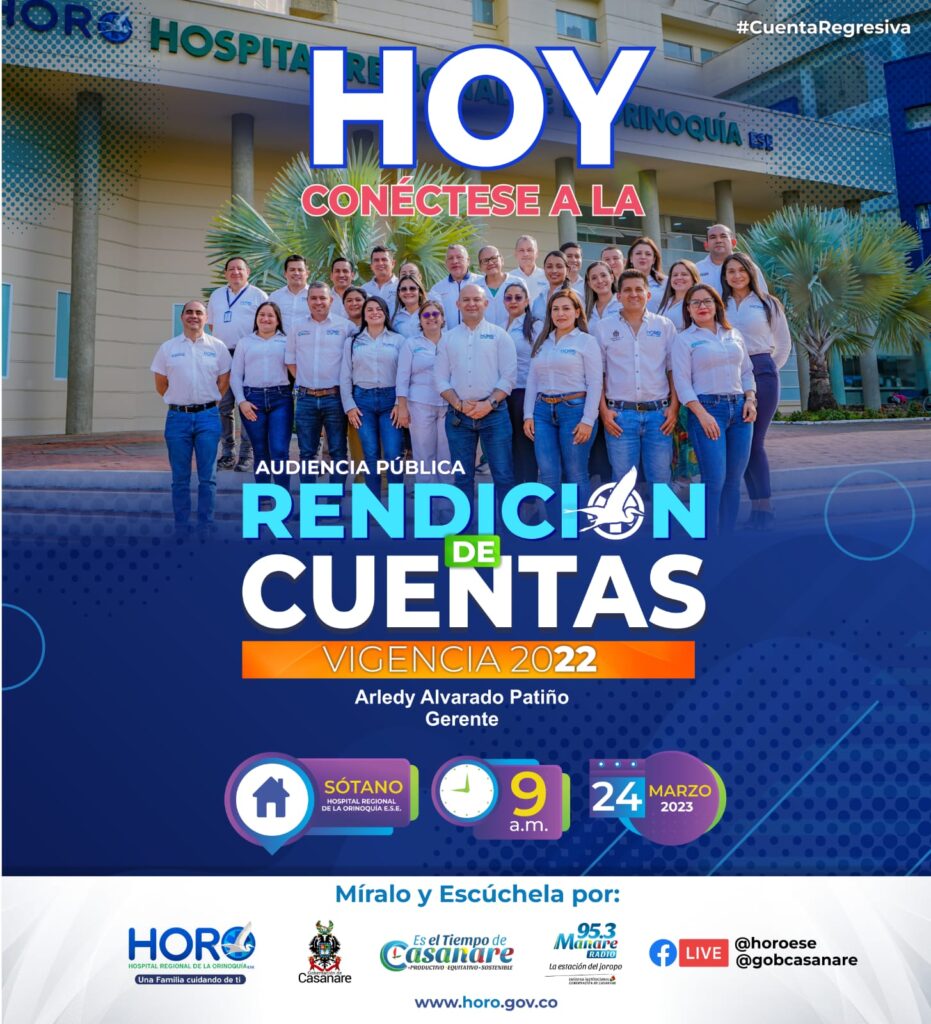Llegó el día de presentar informe a la comunidad, todos los ciudadanos pueden participar conectándose desde las 9:00 a.m. por las diferentes plataformas digitales: @HoroEse y @GobCasanare, Manare Radio 95.3 F.M, medios de comunicación regional y canales autorizados para que siga toda la transmisión de la “Audiencia Pública de Rendición de Cuentas – Vigencia 2022” de la empresa de salud más grande de Casanare.
