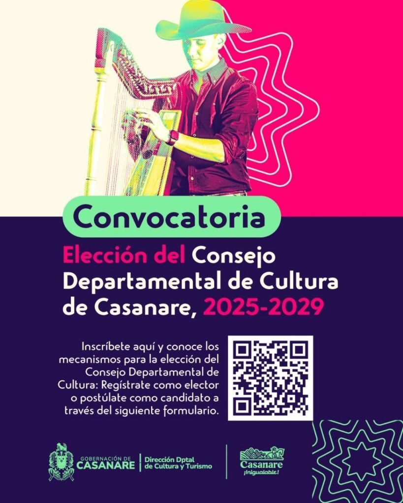 Con el propósito de fortalecer la participación ciudadana y la articulación del sector cultural en Casanare, la Dirección Departamental de Cultura y Turismo cierra hoy la convocatoria para elegir a los integrantes del Consejo Departamental de Cultura, correspondiente al periodo 2025–2029.