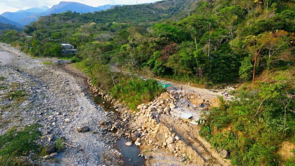 De manera complementaria, se adelantan obras de protección en gaviones, estructuras conformadas por mallas metálicas rellenas con piedra, diseñadas para estabilizar el talud y controlar la erosión. Estas intervenciones buscan frenar la socavación progresiva que año tras año afectaba la calzada y ponía en peligro la pérdida total de la carretera.