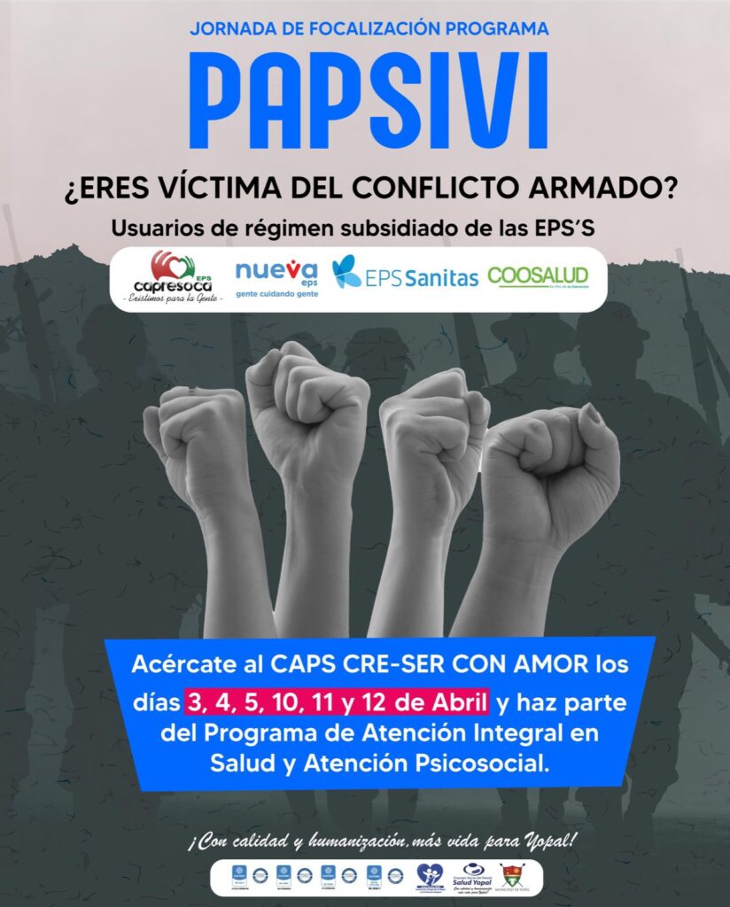 Si eres víctima del conflicto armado de la zona urbana, acércate a la calle 23 # 9-90 los días 3, 4, 5, 10, 11 y 12 de abril y haz parte del Programa PAPSIVI.