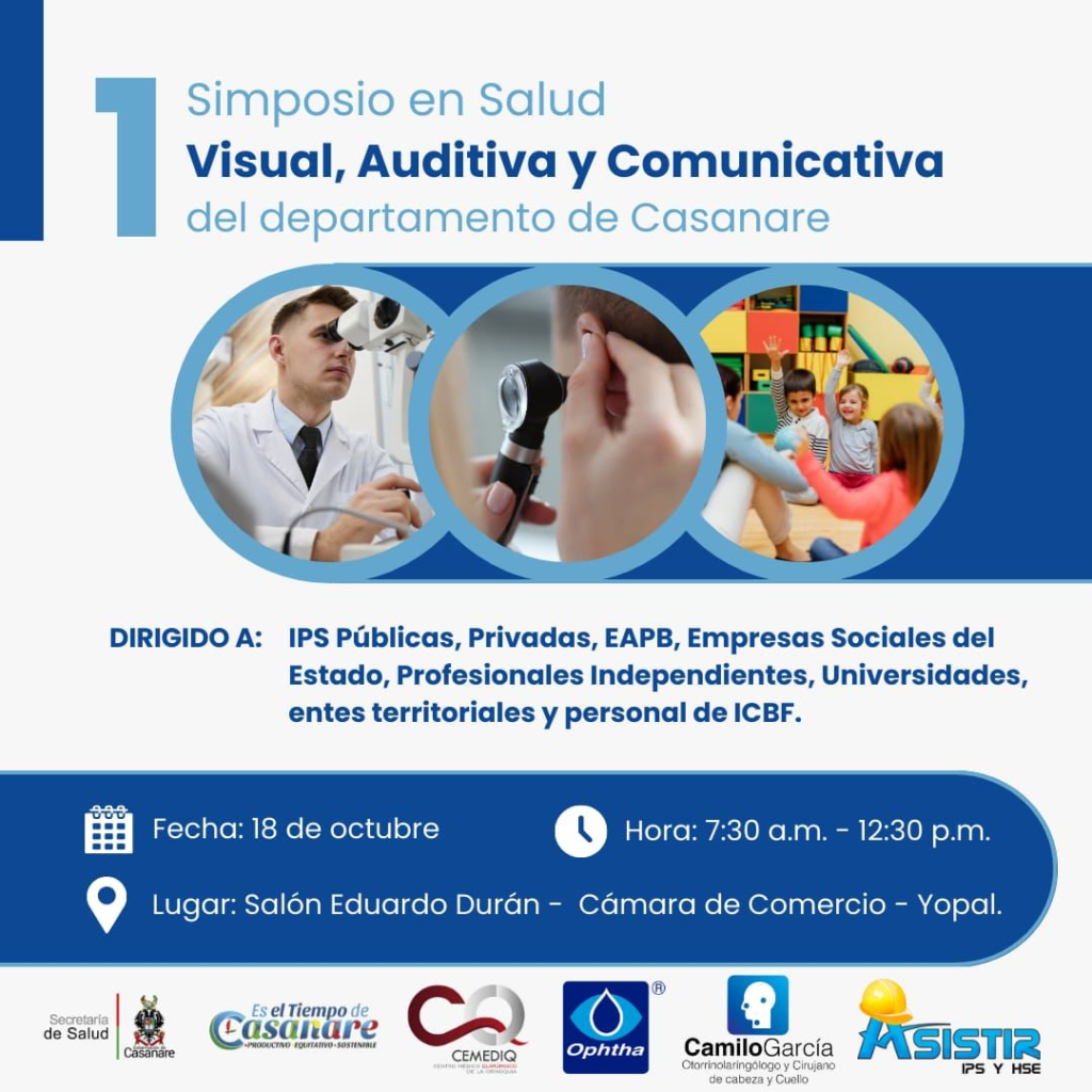 En el marco de la Ruta Integral de Atención para la promoción y mantenimiento de la salud, la Secretaría de Salud de Casanare desde la Dimensión Vida Saludable y Condiciones no Trasmisibles, adelantará el “I Simposio en Salud Visual 👁️, Auditiva 👂y Comunicativa 🗣️”, que tendrá lugar el día 18 de octubre en 📍el Salón Eduardo Durán, de la Cámara de Comercio de Yopal, desde las 7:30 a.m.