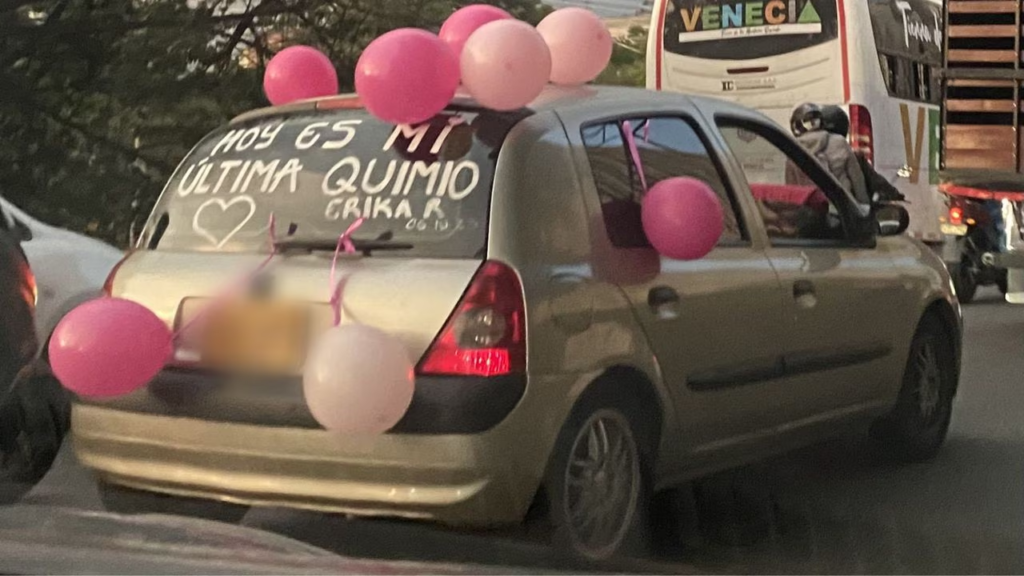 El carro estaba adornado con globos de color rosa y una frase en la parte trasera que emocionó a los testigos: “Hoy es mi última quimio, Érika”. Ella estaba en la parte delantera del vehículo, respondiendo a cada uno de los afectos que lanzaban los desconocidos.