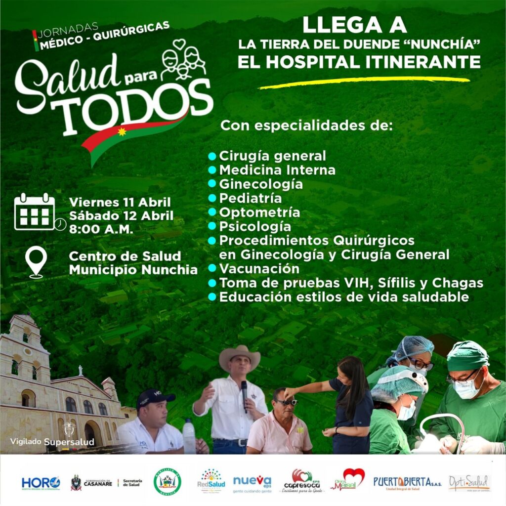 La Gobernación de Casanare, a través de la Secretaría de Salud departamental y en articulación con el Hospital Regional de la Orinoquía (HORO), anuncia la realización de la Jornada Médico-Quirúrgica número 13, que se llevará a cabo los días 11 y 12 de abril en el Centro de Salud del municipio de Nunchía, desde las 8:00 a.m. en jornada continua.