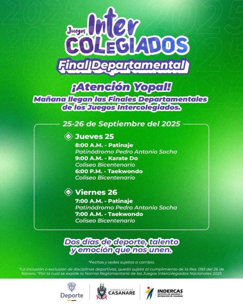 El Instituto para la Recreación y el Deporte de Casanare (Indercas) anunció que este jueves 25 y viernes 26 de septiembre se realizará en Yopal la final departamental de los Juegos Intercolegiados, en las disciplinas de karate do, taekwondo y patinaje.
