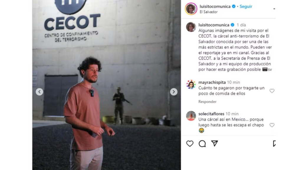 “Algunas imágenes de mi visita por el CECOT, la cárcel antiterrorismo de El Salvador, conocida por ser una de las más estrictas en el mundo. Pueden ver el reportaje ya en mi canal. Gracias al CECOT, a la Secretaría de Prensa de El Salvador y a mi equipo de producción por hacer esta grabación posible 📷”, anotó el joven en la descripción de su publicación, que ya acumula más de un millón de ‘me gusta’ y cientos de reacciones de los cibernautas.