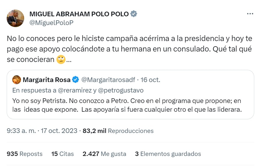 Uno de los primeros en pronunciarse con respecto a la publicación de la vallecaucana fue Miguel Polo Polo, quien actualmente es uno de los principales líderes de la oposición. El cartagenero recordó que el jefe de Estado nombró hace poco a la hermana de la artista como cónsul en Miami.